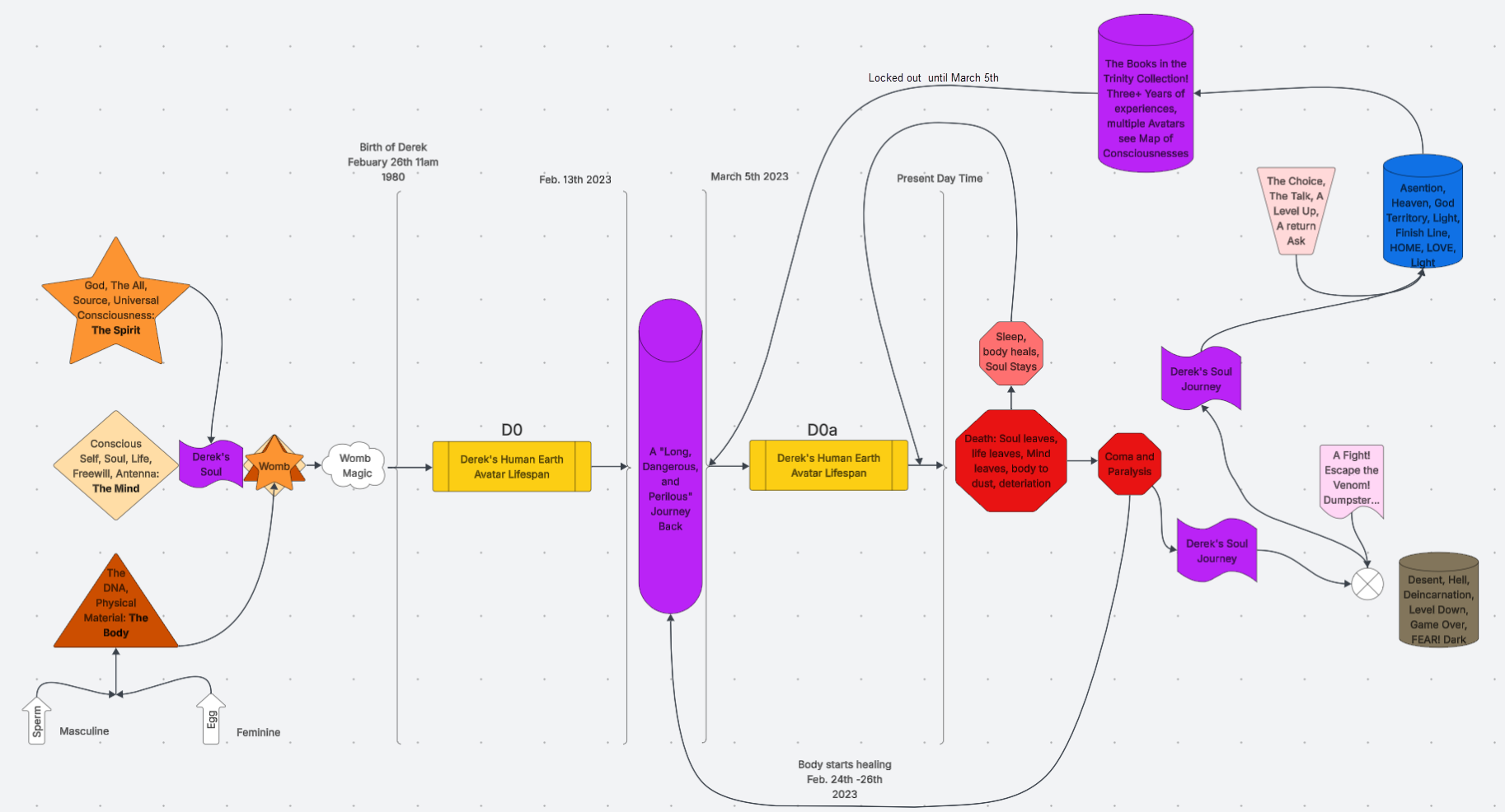 During that time I was taken on a fantastic voyage through what one can only describe as the space between life and death. Having had many names throughout history, Purgatory, Afterlife, Heaven and Hell, Hades, Going Forth By Day and The Halls of Amenti, Dante talked about them as circles in The Inferno. A hero’s journey traditionally….whisked away from the life I understood through trials aplenty and hardships abound. What do you do when you experience a detachment of your consciousness or soul from your body? Mine happened to be blasted to many different avatars or vessel (bodies) 3 weeks our time on earth, body in a coma, my soul seemed to encompass 3 or so years in different levels of time space, through dimensions, through multiple Derek (Dx) avatars before finally finding this one. I was constantly searching for my way back to the correct body…..The one writing this…..D0a as I now see this avatars Derek, back to my ex- wife and children. Back, to tell my story, to touch people spiritually, philosophically, and technologically with prose as well as I can, in order for humanity to learn and grow from my adventure through My Psychedelic Death!